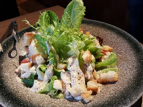 沙拉的部分提供和風、胡麻、凱薩,這三種醬汁做選擇(三選一),這次我們選擇的是凱薩沙拉,帶有淡淡生蒜風味的凱薩醬上頭還撒上起士粉,與生菜搭配一同食用,相當爽口好吃