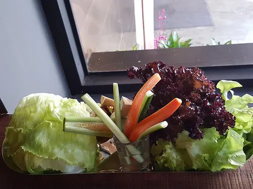 菜盤上,提供包肉用的生菜葉片和需烘烤方可享用的香菇、杏包菇、玉米以及可直接搭配味增沾醬食用的胡蘿蔔條&小黃瓜條。