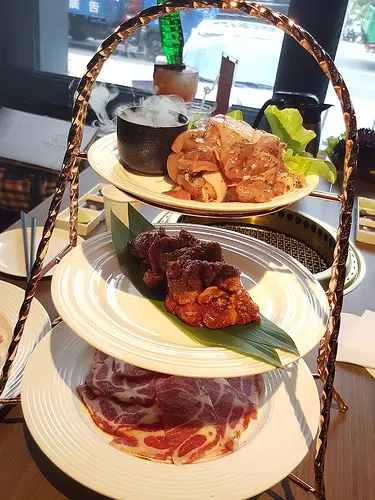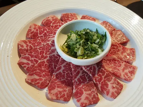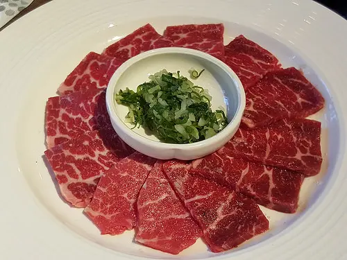 原肉切片上桌,可依個人喜好的熟度做烘烤,搭上附贈調味好的蔥鹽包裹一同食用,相當美味