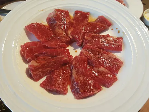 中-牛肋條:牛肋條有事先用醬汁醃製過,但醃製的醬料味並不會過於厚重,還能吃的到肉質的原味,牛肋條似乎有將筋的部分處理過,吃進嘴中不會讓人有久嚼不爛之感受
