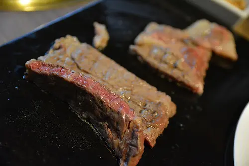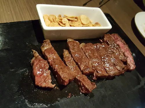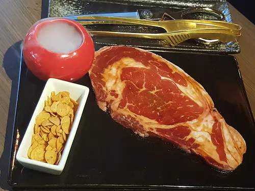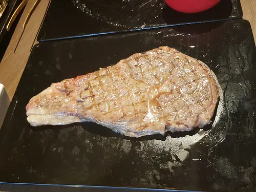 原塊牛排使用的是美國沙朗牛(牛後腰脊柱兩側肉),有鹽味與醬漬兩種口味,如果沒指定口味的話,店家多以醬漬口味出餐