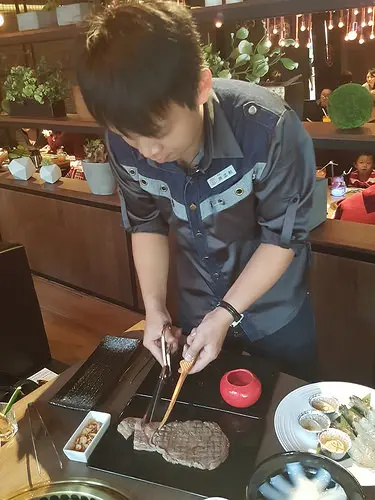 烤熟後,服務員還貼心地幫我們做分切的動作