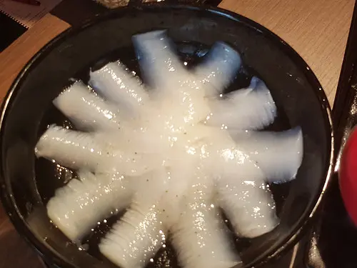 使用柴魚昆布湯頭加入軟絲、干貝、、牡蠣、生蛋、米等一同熬煮,米粒完全吸收海鮮高湯的精華,吃起來鮮甜滑口相當美味