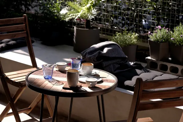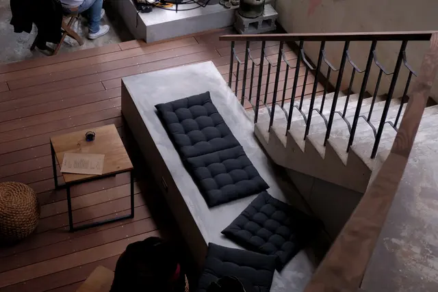 室外的空間,水泥石塊座位兩旁是延伸通往二樓的樓梯,