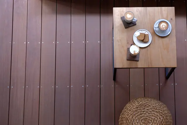 刷新補強再添上裝飾的木頭層櫃、桌椅與燈具,