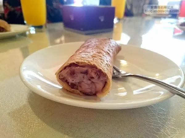 現做飯後甜點 - 芋泥蛋捲,蛋汁鮮煎成薄餅,然後把芋泥放上去在包起來就完工囉!!