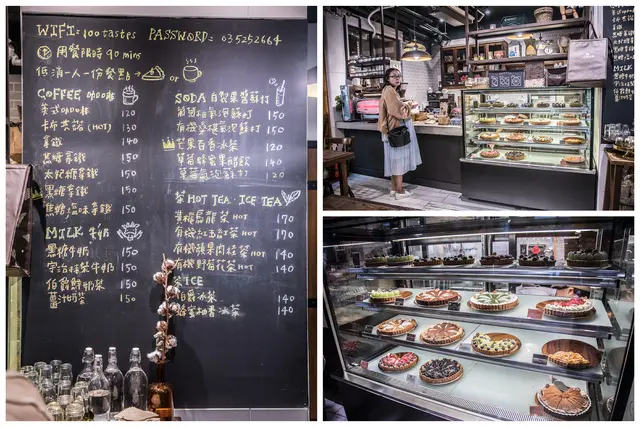 用餐限時90分鐘,低消一杯飲料,旁邊的小黑板都有飲料的品名可以看,價位約莫150元左右,櫃檯前的冷藏櫃中有今日的水果塔的所有品項,因為都是手工製作,而且水果都很看季節,所以水果塔的數量都不一定,熱門的季節限定款有時候一下子就賣光了,來到一百種味道真的會選擇障礙大發作,每一樣看起來都好好吃!
