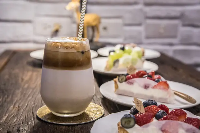 友人點的冰拿鐵,上面是咖啡下面是牛奶,漸層看起來很漂亮