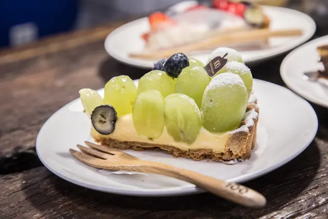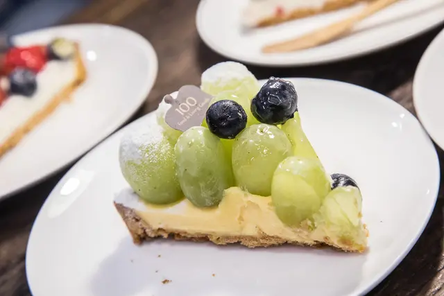 這個超厲害!上面堆滿滿的綠葡萄,綠葡萄吃起來水嫩多汁,甜度超高,感覺跟咬咬在美國吃到的棉花糖葡萄很類似,只帶一咪咪酸味,加上下面自製的綿軟乳酪及酥脆的塔皮,超好吃!