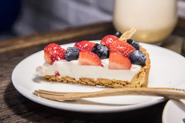草莓正當季,一定要來一份草莓甜點,一百種味道的奶油餡會隨著水果的種類不同來做變化,像是生乳酪莓果塔因為水果酸味比較重,就使用乳香味比較重的餡,讓莓果的酸氣變得更圓潤順口,草莓超甜超好吃,加上塔皮一起吃極富層次口感