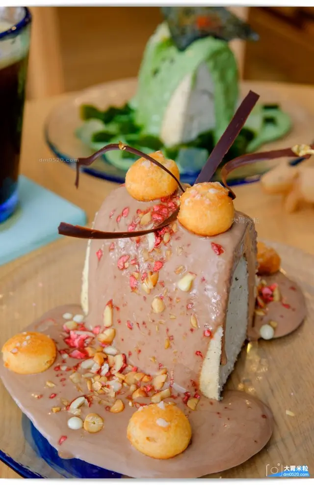 上層妝點的巧克力居然還有金箔,加上手作小泡芙,整個像瀑布流洩非常美!