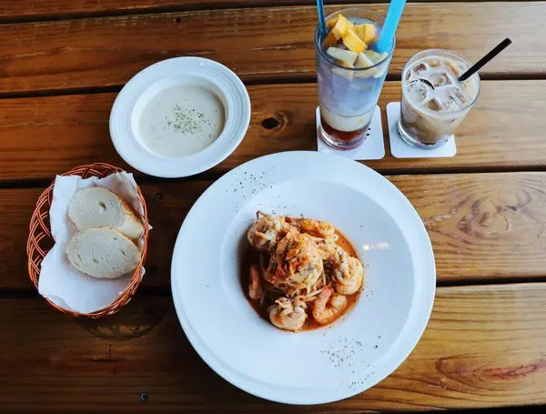 小資今天點了粉紅鮮蝦花枝義大利麵、太妃糖拿鐵和蝶豆花冰果茶