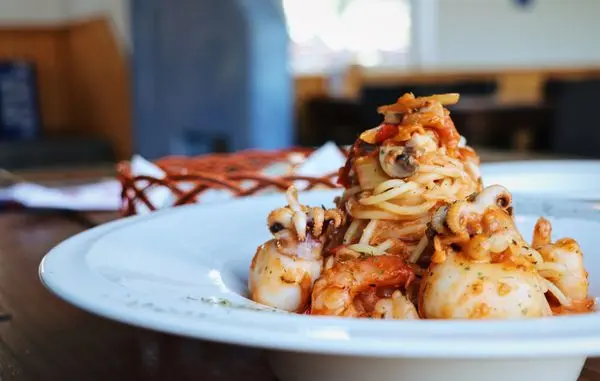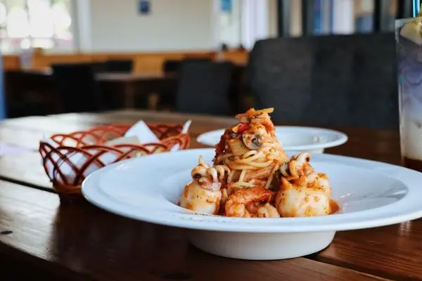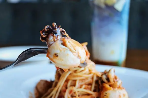 這道義大利麵盤裡的花枝和蝦仁超大塊,尤其是這花枝,超大隻又Q彈