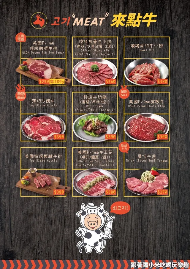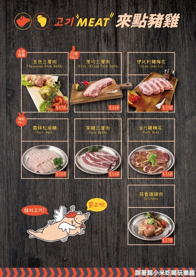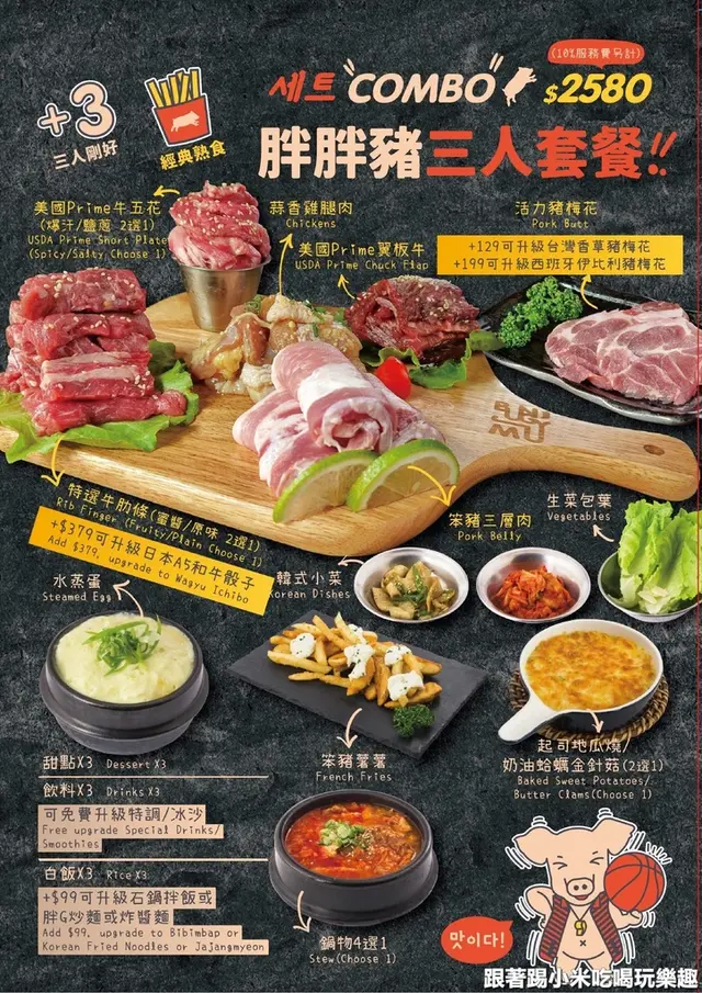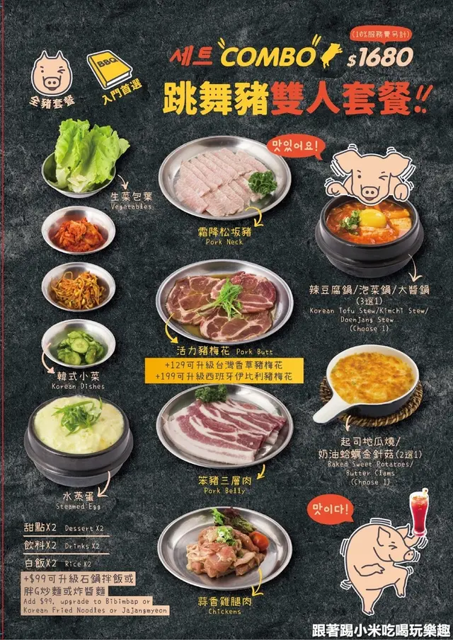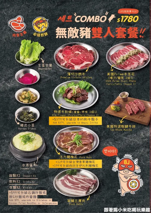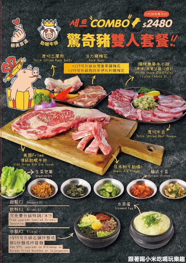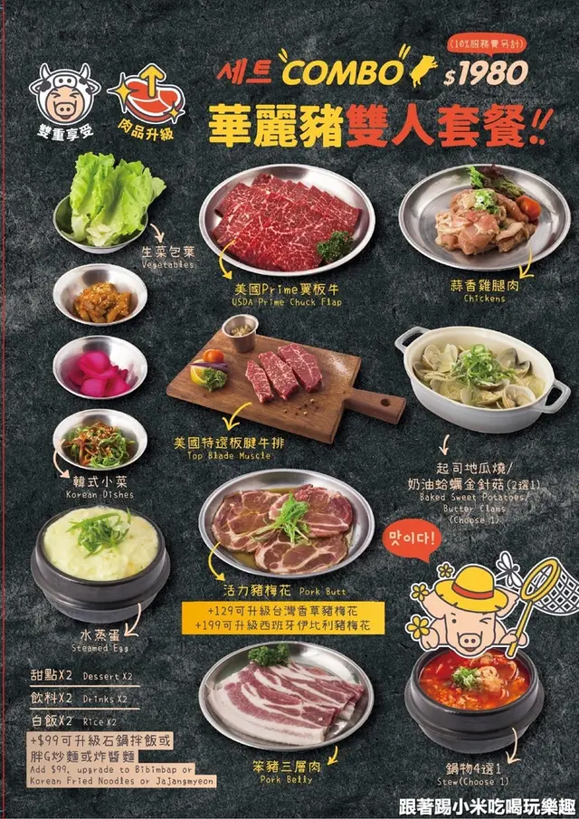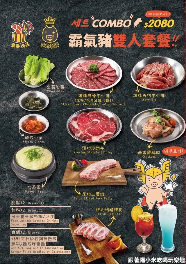 除了韓式小菜及生菜無限續點外,有燒烤無骨牛小排.燒烤角切牛小排.薄切沙朗牛.蒜香雞腿肉.厚切三層肉.伊比利豬梅花.水蒸蛋.甜點*2.飲料*2(可免費升級特調/冰沙).白飯*2(另外可+99元升級石鍋拌飯或胖G炒麵或炸醬麵),這樣兩人吃超飽XD