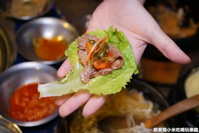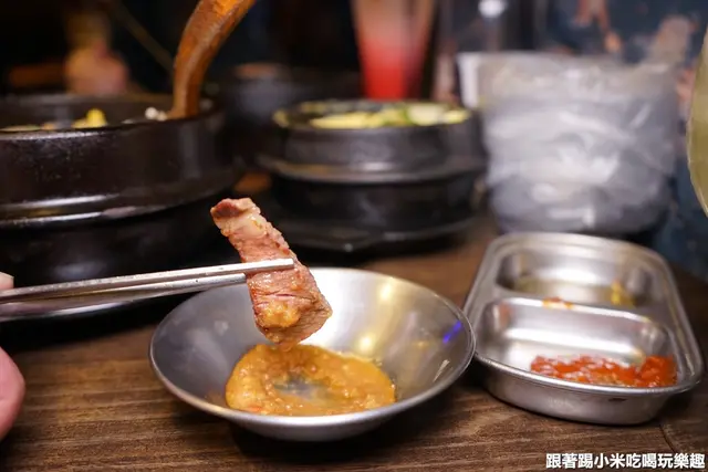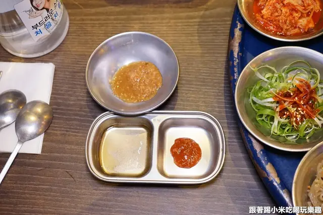 在醬料上他們很請究,上面一盤是果香蜜醬鹹香中帶果香甜味,是比較清爽的口味醬料,海鹽麻油是比較鹹的代表,韓式味增醬是帶點辣味甘甜。