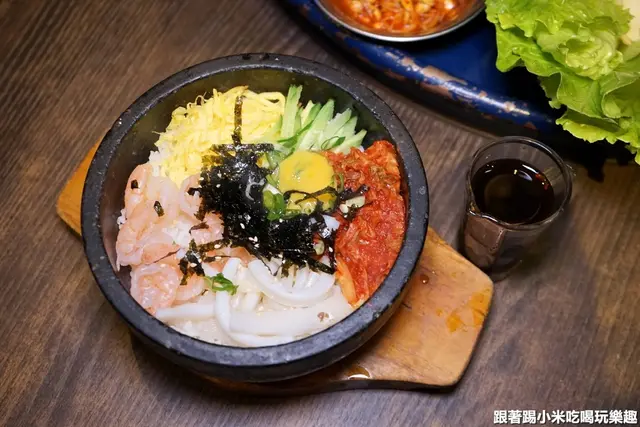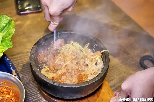 這是將套餐的白飯+129元換的石鍋拌飯,裡面可是有滿滿的海鮮及其他食材,上桌時熱吱吱作響很誘人,店員會給客人拍照後再幫忙拌飯(請盡快拍照不然會焦掉唷)