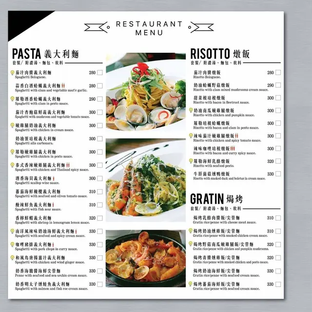 套餐價格在280~330之間, 有麵包.濃湯.飲料等, 食材從有雞肉.培根.海鮮.肉鮮.鴨等多種選擇, 對素食朋友來說還有蛋奶素及全素的選擇, 符合不同口味朋友一起聚餐很方便~ 另外還有一些單點炸物小點心.
