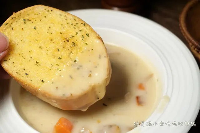香蒜麵包是每人兩片, 剛上桌熱熱的吃蒜香夠味脆脆的很好吃, 當然小米最愛沾濃湯吃了