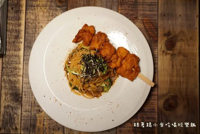 吃完小點後開始吃主餐囉~和風島唐揚薑汁義大利麵 330元(套餐), 唐揚雞塊就像剛剛說的口味, 比較特別的是這款義麵醬汁是走日式風, 加了不少洋蔥日式和風鹹香甜味都跑出來了 加上帶點麵心麵條給小米一個很不一樣的義麵風味. 覺得女孩子們會很喜歡