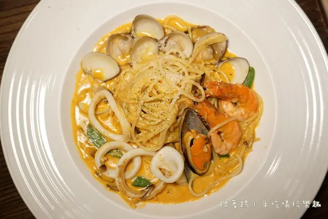 南洋風辣味奶油海鮮義大利麵 330元(套餐), 這是愛吃海鮮的朋友可以試看看, 海鮮的料夠多外也很新鮮, 南洋風的奶油帶小辣口味也引出了海鮮的鮮味