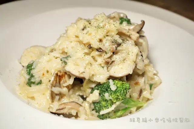 最後一道是奶油蛤蜊野菇燉飯 290元(套餐), 如果拿掉蛤蜊也是一道很有"菇菇"香氣奶油燉飯. 而這一道比較特別的地方是九層塔跟燉飯"混"在一起, 讓軟Q燉飯多了一些脆脆九層塔香的口感
