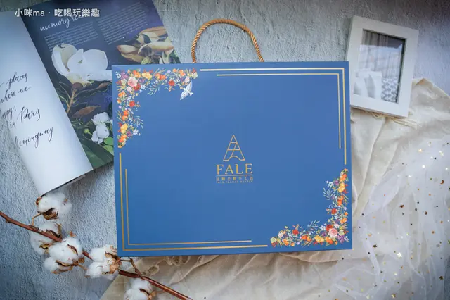 禮盒走的是沉穩的藍色,配上邊角的彩繪花飾增添一抹柔和,盒上有附提繩,直接把禮盒提著走,送禮也很大方