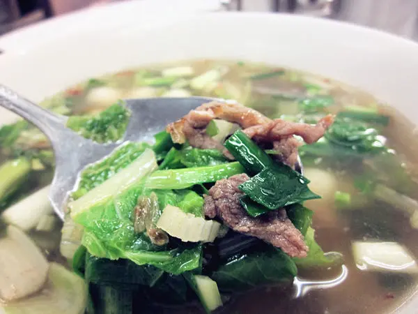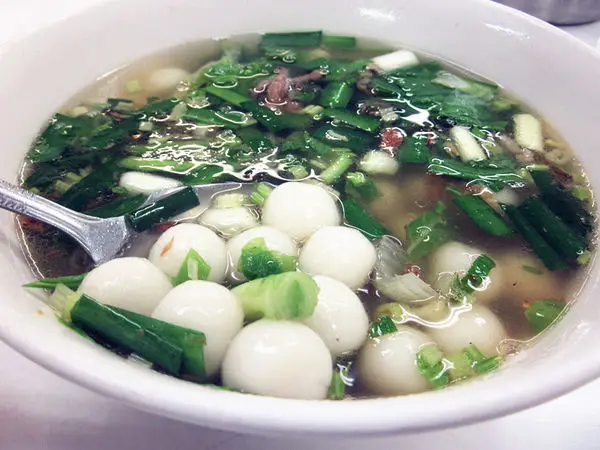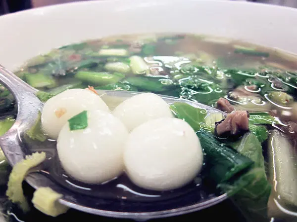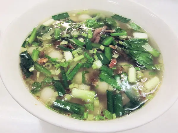 湯匙一撈,無數白白嫩嫩的湯圓和大量的客家小韭菜都跑上來了,湯底帶有油蔥的香氣,熱氣騰騰又香噴噴,湯頭嚐起來不會太油膩。
