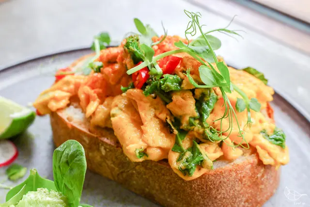 艷紅的辣椒看似濃烈,但似乎並沒有一起炒進蛋裡,反倒是羽衣甘藍是和蛋一起拌炒,整體吃起來並不會感到特別辣,較像是擔當了豐富層次的效果。搭配下方較有嚼勁的麵包,吃起來口味比想像中濃郁且飽足,若擠上一旁附的檸檬汁,些許酸楚更加提味;不過相對地羽衣甘藍的存在感則變得淡薄,本以為它會是主角的我還是感到有些可惜。
