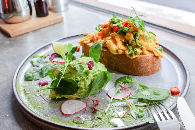但另一亮點就是一旁的酪梨泥了吧?吃起來滑順無苦味,搭配一旁生菜一起入口也很清爽;而我是和炒蛋及麵包一起入口,再沾取一旁的海鹽,全部一起吃起來十分濃郁卻不會感到膩口,我想辣椒、檸檬和海鹽都有很大功勞,也出乎意料的所有食材一起吃也不感到突兀,整體平衡感很好、我個人很喜歡。