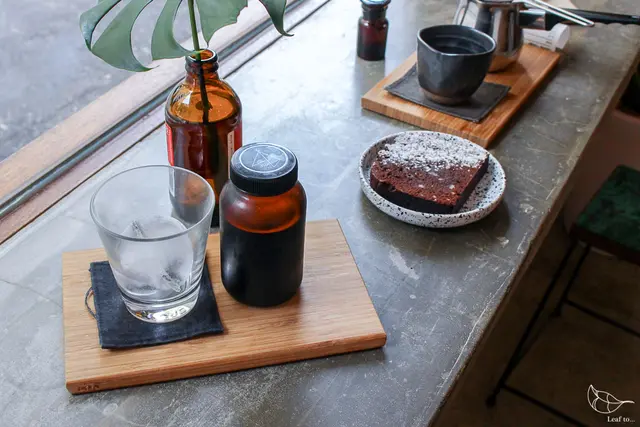 店家的工作吧台也在後方這塊區域,有些當日提供的常溫點心會展示在玻璃櫃裡。店裡的人員挺多,在吧台裡卻不令人感到擁擠,且大家都談笑著、感覺十分開心且愉快地在享受著自己的工作崗位,這樣的氣氛渲染開來,讓我感到非常喜歡、自在。