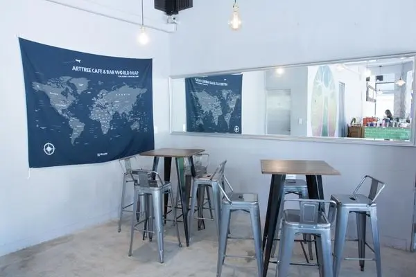 右方角落和外頭一樣的冷色系高腳椅區,及零星幾個木桌椅 -