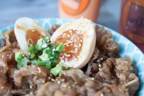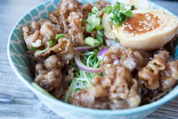 這碗牛燒丼飯的牛肉更精實,邊邊角角在料理後走的是濃厚的口感與調味,