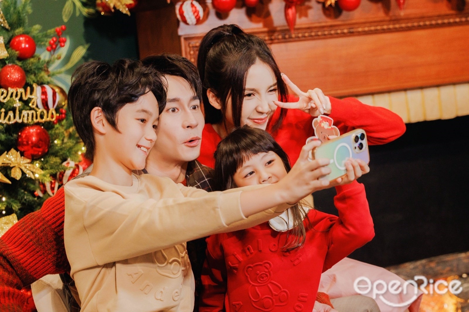 在溫馨的壁爐佈景旁,全家大小一同趣味自拍,記錄下充滿英倫風情的甜蜜時刻,感受濃厚的聖誕暖意。
