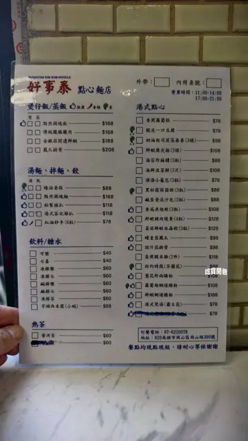好事泰點心麵店 (高雄/屏東) 網址: https://s.openrice.com/cHRSn02z8g5W0 地址: 高雄/屏東岡山區岡山路390號 電話: +886 076220078