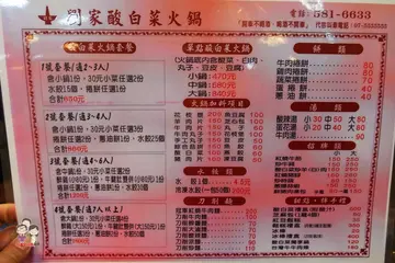 終於吃到了我朝思暮想的劉家酸白菜火鍋了實在太感動了!!!結果郭先生居然還遲到害我真得很不好意思要求大家讓我拍照後再吃(因為郭先生的朋友等了許久 菜都上齊了 我們還沒到)所以這次的照片有點少大家莫見怪(要怪就怪郭先生XD)______________________________地點:高雄市左營區介壽路9號電話:07-581 6633營業時間:1100~2230 (建議先訂位)______________________________ 位於在眷村內用衛星導航蠻方便的 很好找附近也有停車位劉家酸白菜火鍋在北高雄非常有名分店也蠻多間的郭先生朋友推薦我們創始店 說是最好吃的(不過他要我們也別抱太大期望?XD)幹嘛這樣 我們沒有吃過 不要嚇我們!!!大大的LOGO 是北台灣火夯的連鎖火鍋店 場地非常非常的寬闊還有冷氣我們抵達時約六點 人已經快二分之一我們離開的時候 客滿!!!真的不誇張!!!!(所以一定要訂位 不然就早一點到) 一抵達後 菜全上桌了因為友人等我們太久了 加上桌席還有小孩子(真是不好意思 讓小孩子餓肚子)所以我就沒有逐一拍照了 友人是選套餐 四號套餐 (6~8人使用) 2050元其實換算下來不貴內容物有:大鍋一份35元小菜任選4份醉雞牛鍵肚雙併捲餅任選三份蔥油餅2份水餃30個紅豆鬆糕8份一上桌感覺蠻少的可是吃完後 各各都飽了XD 我終於吃到了 其實心底超感動的!!!因為我真得很愛酸類的東西像平常吃火鍋 我都是沾白醋或式檸檬吃所以我很喜歡酸白菜火鍋然後劉家的酸白菜火鍋湯頭非常的優秀讓人忍不住一碗接一碗我喝超多碗的湯頭還可以無限續加好愛阿>"< 捲餅郭先生覺得很好吃 (他說最好吃的就這道)我覺得還OK 我其實不太喜愛蔥油餅類的) 紅豆鬆糕就是甜點 走古早味路線的外觀好看吃起來就是普通的鬆糕我是有一滴滴的失望啦 醉雞還蠻入口的沒兩下子 清潔溜溜 白肉給的很徹底 還蠻多的而且肉的質感還不錯每一塊都蠻大片的 也有厚度吃起來有存在感XD 這是菜單 價錢其實算普通 覺得套餐比較划算ˋ火鍋料我們沒有加點光是湯頭就很好喝了XD然後水餃也蠻大顆了真的會有飽足感 貼心的這裡還有充電手機區!超級加分!! 最後出來還特地請教友人拍照技巧拍的還不錯吧XD(不是我拍的 可是相機是我的) 真的會讓人想要砸單眼幹嘛這樣燒我ㄒㄧㄒ!!!總之!!!我覺得湯頭部分真得很讚酸白菜跟白肉也給得很徹底下次還是會回訪啦喜歡酸白菜火鍋的人應該會很愛就是了有酸到我個人很喜歡XDDD