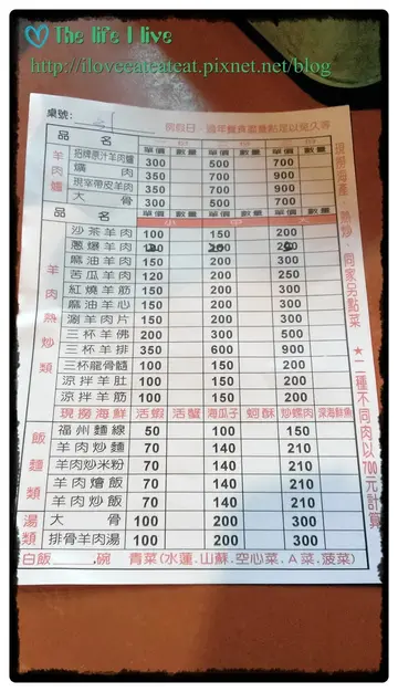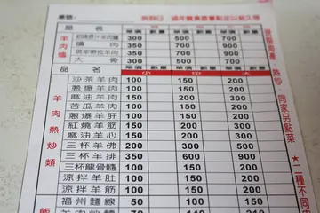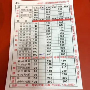 火鍋加菜區域 / 羊肉炒麵 / 沙茶 羊肉 / 炒羊肚 / 炒螺肉 / 青菜 / 帶皮 羊肉 爐 / 帶肉大骨頭羊肉湯100元 / 蚵酥 / 麻油羊肉 / 麻油腰子 / 湯頭 / 當歸羊肉湯 / 福州 麵 線 中 / 鳳梨蝦球