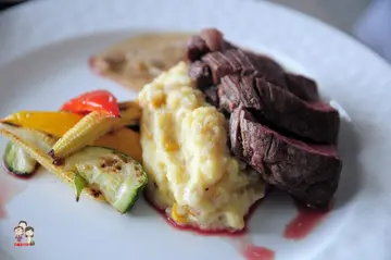 沐餐廳主張fine dining,以創意融合在地美味。餐廳內裝以大地色系為主,燈光暈黃,氣氛沈穩、溫緩。當晚用餐我們指定時間,到門口時會由櫃臺的接待人員確認房號,引導入座。因為是渡假飯店,早餐、午餐、下午茶等用餐時間,衣著以輕便為主,晚餐時間建議注意一下服裝儀容,太過休閒的背心、短褲、夾腳拖鞋等不適合哦~座位間以半開放的垂簾隔開,保有一定的距離與私密性。餐具提供刀叉、筷子等,因為菜色走創意路線,中西兼融,可依自己喜好方便使用。特別一提,座椅搭配的小靠枕巧妙地支撐著腰背間,坐起來十分舒服,設計得很不錯。當天享用的是晚間套餐,為六道式,包含開胃小點、前菜、湯品、雙主菜及甜點。套餐菜色由主廚依每日食材種類調整,每天都有不同的驚喜。除了套餐外亦有單點菜色,西式的沙拉、三明治、漢堡、牛排等,中式的炒麵、炒河粉、牛肉麵皆有,價格從280元到1800元間,需另加一成服務費。雙人下午茶套餐990元,看了一下介紹滿精緻的,下次有機會再訪試試看。泰式蝦餅美麗的金黃色,吃來酥脆而不油膩,搭配紅綠雙醬,紅的是泰式酸辣醬,有檸檬香,微辣爽口。綠的則是芥末酪梨醬,滋味豐潤中帶有辛香及甘味,好吃。服務人員特別為我們介紹,沐餐廳對於餐具有極高的標準與堅持,特別到鶯歌找陶藝師傅訂製,一物二用,像是蝦餅的盛盤,翻過來即可當作淺碗使用。涼盤前菜 - 鳳螺、烤活鮑、鮮蚵以長型黑岩石板裝盤,三款充滿海之風味的海鮮冷食,搭配綠黃紅白橙等多色食材,鮮明亮眼。每次上菜,服務人員都會仔細解釋食材及作法,說明得很清楚。鳳螺肉巳取出,方便實用,微鹹微甜,軟而有嚼勁。黃帶些橘色的是胡蘿蔔醬,有奶油香及甘味。鮑魚肉質紮實有彈性,愈嚼愈香,滿口都是鮮美海味,搭配冰心地瓜、奇異果、番茄、櫻桃蘿蔔等,香甜爽口。番茄可是自家菜園種的哦~鮮蚵飽滿、滑嫩,鮮度一流,佐上水牛起司及和風醬,軟潤濃郁加上清爽的微酸,滋味豐富多變化。美國蘆筍花帶些微苦,清新爽口。胡蘿蔔醬上是三種糙米、義大利米製成的米香,以紅胡椒粒増香添色。特選house wine義大利的白酒,清新爽口,搭配海鮮很柔順。霸王花燉排骨湯這道湯品是偏港式的煲湯,霸王花是仙人掌科,在港式煲湯中是常用的食材,據說有消暑潤肺的養生功效,還加入了南北杏。因為夏日炎炎,主廚特製了這道消暑的清爽湯品,霸王花吃來軟而帶些微滑,類似於曇花,湯頭甘潤溫和,清甜好喝~排骨肉質軟嫩,軟骨處Q脆,口感很棒,還有紅白蘿蔔塊等,都很好吃。碗也是鶯歌訂製的手工陶瓷,外觀樸實沈厚,保溫效果很好。主菜準備上桌前,服務人員先送上品嚐龍蝦不可少的專用夾具。 碳烤波士頓龍蝦每人半隻龍蝦,大小適中,肉質飽滿,因為很新鮮,取肉滿輕鬆的,蝦螯大得驚人,裡頭滿滿都是肉(感動)龍蝦肉厚實,微鹹帶有濃郁的海味,滋味鮮甜,口感紮實而Q彈,蝦頭有大量的蝦之精華 - 蝦膏,豐潤腴美,鮮美得令人陶醉,好好吃、好滿足!!!搭配的萊姆烘烤過,微焦而香氣四溢,一旁有些許生菜洋蔥,佐以清香青醬,清爽開胃。一般吃完龍蝦,餐廳都會送上檸檬水淨手,沐餐廳送上的可是熱呼呼的檸檬茶,散發淡淡清香,洗起來舒服又乾淨,特別能去除異味,好貼心。更換主菜時,餐具也一併更換,避免重覆使用沾染味道。楓糖丹麥豬烤季節時蔬丹麥有「養豬王國」的美稱,特地從丹麥進口優質豬肉,以楓糖烘烤,加入焦糖香氣再煎得酥香。肉質偏瘦,肌理緊密,肉質卻非常軟嫩,稍一用力即可輕鬆切開,入口軟嫩有彈性,肉汁豐沛,香氣滿溢口中,表現非常好。餐後飲料博士茶加上青木瓜及芒果去發酵,聞起來有著甜甜的果香,喝起來口感溫潤,有淡淡的甘味。喝起來很舒服、放鬆……然後有個笨蛋太放鬆結果忘了照茶=_=所以此款茶品只能用文字介紹了QQ飯後甜點 - 榛果巧克力捲蛋糕捲及巧克力醬在燈光照紙下閃閃發光,宛如鍍上一層金粉,綴以細碎堅果及鮮綠薄荷葉,擺盤很精美,蛋糕溼潤而柔軟,濃郁的巧克力甘苦滋味,加入酸甜的百香果醬添加變化而不膩口,非常好吃,很有水準的一道甜品。晚間套餐表現得很好,無論是餐廳環境及用餐品質都很棒,餐點表現無可挑剔,從食材、調理、擺盤,出菜的順序等,都可以感受到華泰瑞苑特有的精緻、細膩、優美、慢活的舒緩氛圍。從前菜到甜點,每一道都很美味、令人印象深刻,主菜的龍蝦鮮美無比,豬肉的軟嫩多汁也毫不遜色,精緻的甜點更是劃下完美的句感。早餐是個人套餐式,提供手工麵包、花園沙拉,主餐部份有蘑菇燒烤牛肉、香料嫩雞、丹麥豬佐松子鯷魚、中式粥品、煙燻鮭魚薯餅、香蕉卡士達鬆餅等,餐後提供鮮果、咖啡或茶。亦有提供兒童專用的餐點~手工麵包盤麵包柔軟有彈性,滋味香甜,搭配三種佐醬、橄欖油加紅酒醋、藍莓醬、起司搭米香,麵包吃不夠可以再續哦~綜合果汁 - 西瓜、鳳梨色澤鮮紅,新鮮現打,富有纖維質,酸甜可口。花園沙拉醬汁是清爽的薑汁油醋,清香溫和不會過酸,很順口生菜、番茄、洋蔥加上起司,很清爽開胃。 蘑菇燒烤牛肉牛肉品質滿好的,是特選的美國沙朗心,上桌時切成薄片,呈現半熟的美麗粉色,混著雪白的蛋、鮮綠菜葉及褐色蘑菇片等,色澤鮮明美麗。服務人員有事先詢問蛋的熟度,老公點了半熟蛋,結果上桌時怎麼看怎麼覺得不太對……那個蛋看來好飽滿好固體好熟啊……切開一看,果然……弄錯變成全熟蛋了QQ