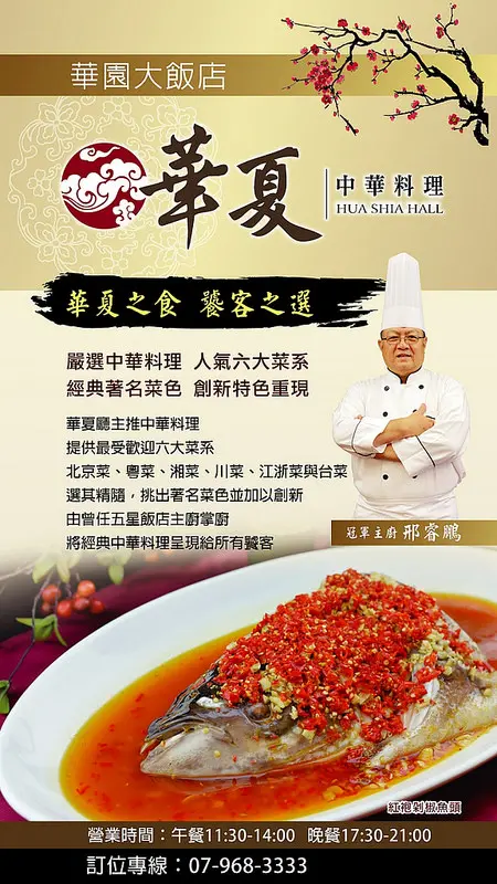 華園飯店-華夏廳 (高雄/屏東) 網址: https://s.openrice.com/cHRSn02JsC600 地址: 高雄/屏東前金區六合二路279號 電話: +886 079683333