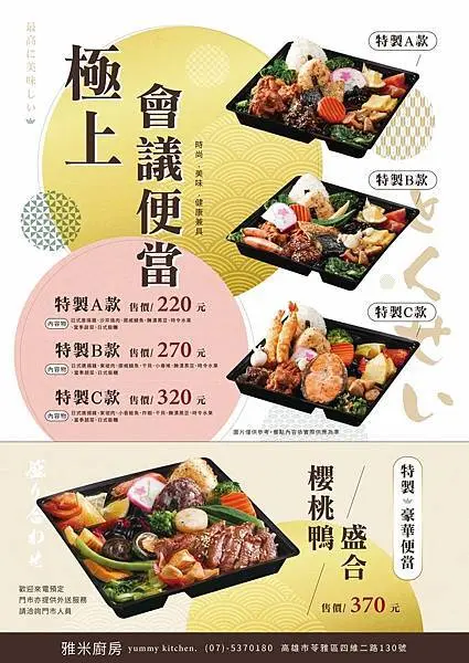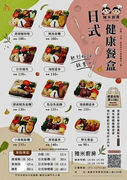 現在高雄便當市場選擇真的非常豐富傳統便當還有健康便當之間想要取得美味平衡?雅米廚房是我個人很推薦的選項, 用更精緻的食材 , 健康料理手法 更有特色主餐選擇, 還有豪華又氣派的會議便當不管是家裡平時晚上用餐,還是公司的會議需求都可以滿足採用預訂方式 , 時間到取餐就OK 雅米廚房位於四維光華路附近也就是文化中心週邊區域, 走一個家庭式的空間現場也有少量內用座位可以用餐如果在中午比較沒有地方吃飯的朋友, 可以選擇在這邊享用, 豐富的餐點, 比簡餐便宜很多 ~店家提供兩個系列產品 , 分別是百元手作餐盒, 還有200到400元高級會議便當, 百元選擇當中也有採用三角飯糰的餐盒, 有些功夫菜像東波肉 , 烤鮭魚 沙茶燒肉等 雅米廚房採用傳統餐盒方式提供三種當天新鮮蔬菜, 蔬菜都是採用川燙方式不油膩 每天都會更換~ 極上會議便當 特製A款 $220羨慕韓劇日劇都有精緻的開會便當?現在台灣人越來越多廠商供應, 採用紙盒包裝, 份量也有增加整個看起來的感覺就是很不一樣~特別提供手作飯糰來取代白飯 , 醬油飯糰會帶著微淡的清香, 也比較有黏度 , 單獨吃非常不錯 有沒有想到一般餐盒也可以吃到手工東坡肉 ?東坡肉是店家自己綁的, 綁成小塊還蠻可愛很喜歡東部肉肥肉的部分滷得很透 , 吃起來完全不會有油膩感口味上也沒有傳統這麼鹹非常下飯, 喜歡這傳統外省菜美味很推薦可以點看看 ~海陸盛食 $110這份是這邊銷量非常不錯的海陸雙拼只要110就可以吃到美味的日式炸雞還有烤鯖魚 大推日式炸雞 使用日本進口日清炸雞粉, 吃起來完全不輸日本料理店外酥內嫩外皮不過厚, 雞肉吃起來多汁非常驚喜 這份餐盒本身也是提供精緻飯糰組合, 飯糰有兩種不同的口味一個是原味一個是醬油 ~ 虱目魚飯糰 $135在台式小吃店裡, 乾煎虱目魚肚一向都很受歡迎 可品嚐到魚肉的鮮甜細緻,以及魚肚豐富油脂帶出的軟嫩口感風味店家處理兩面都有一定的脆度現在市面上的健康便當有兩種風格從真的很清淡像水煮雞胸肉加入紫米跟大量蔬菜, 另一種是從傳統便當改良就像雅米廚房一樣, 用更健康方式來呈現,傳統便當美味用料非常好 , 感覺就像媽媽的手藝一樣 會議便當高級的來內容豐富, 用來招待客戶不會失誤, 趕快也來預訂一份吧 ~…查看更多
