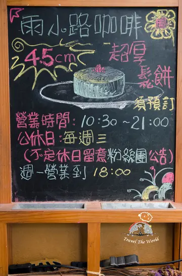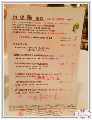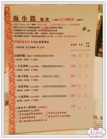 雨小路咖啡 私料理 手工烘焙點心 下午茶 服飾雜貨精品愛莉絲也不知道雨小路怎麼爆紅的~~~ 似乎是因為厚鬆餅吧!!!!!! 雨小路咖啡~位在中正路上某條小巷弄內~~~ 原本應該是一家服飾雜貨精品店吧!!!!!! 門口有張貼用餐小規定悠~~~ 似乎比較不方便帶小朋友哦~~~ 如果小朋友比較不受控制的話。可能要考慮一下。 4.5公分的超厚鬆餅是需要先預約的~~~ 每日限量6份。需2日前預約。因為製作過程需要花比較長的時間!!! 所以~~~請大家一定要先打電話預訂悠。。。 店內空間不大~~~ 除了幾張桌子 / 吧台 / 還有一區服飾雜貨精品!!!!!! 位子真的很少~~~~ 所以不要突然跑來吃呀。。。。 不過店內好溫馨~~~ 走粉紅色路線的!!!!! 每人低消NT100元。4.5厚燒系列有4種口味: A. 花見厚燒 NT$240元: 原味 B. 暖日厚燒 NT$260元: 杏仁茶C. 牧野厚燒 NT$260元: 牛奶焦糖佐蜜核桃D. 小城厚燒 NT$260元: 蜜紅豆+抹茶不過有人告訴我2CM的京都厚燒比較好吃啦~~~~ 以上都有附: 果醬/冰淇淋/手工餅乾。 另外還有餐食系列~~~ 想吃點鹹食的可以點悠!!!!!! 飲品~~~ 這個布丁狗小饅頭好可愛~~~~還有變型KITTY耶~~~~ 哈哈 牧野厚燒 NT$260元: 牛奶焦糖佐蜜核桃真的很厚耶~~~ 感覺超費工的。。。聽說做一個需要花半小時以上耶~~~ 我們可以吃到現成的真的太幸福的!!!!! 很像是海綿蛋糕淋上焦榶跟核桃!!!!! 其實跟我想像中的厚鬆餅不一樣啦~~~ 因為我也沒有吃過.。。所以有自己想像一下。。。沒想到口感很像海綿蛋糕。很軟很綿~ 還不錯吃!!!! 根本切不好~~~ 切下去就毀了。。。。。 整個軟綿綿的好特別的~~~牛奶焦糖很香耶~~~ 小城厚燒 NT$260元: 蜜紅豆+抹茶 抺茶味好像還好~~~~ 紅豆好像沒有很多~~~~~ 我們都覺得抺茶的還好~~~~~~ 但口感還是很鬆軟!!! 不難吃悠。。。 附贈的冰淇淋跟餅乾~~~~~布丁狗饅頭好吃耶!!!! 很酥~卻又入口即化的口感~~~ 拿鐵拉花~~~~~ 哈哈哈哈哈... !!!!!!PARLARE比較利害啦。。 飲品就都普通囉~~~~~~ 4.5CM厚鬆餅~每日限量6份。需2日前預約。查看更多