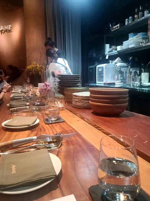 人生有榮幸朝聖號稱是南台灣最難訂的餐廳「AKAME」是主廚江振誠的徒弟「彭天恩」主廚所創立的餐飲品牌整體用餐體驗,服務好的無可挑踢,氣氛也相當不錯至於餐點非全都符合個人口味,不過上菜時店員都會詳細介紹,的確讓每道餐點聽起來既費工又更顯得珍貴稀有畢竟我非專業美食評論、也非會下廚的人,許多料理就是要配「故事」來品嚐啦(笑)怕自己說得太不專業,以下多是記錄餐點上菜時店員的口述,個人淺見也就簡單帶過囉 商家名稱:AKAME(屏東縣霧台鄉好茶村古茶柏安街17巷8號)營業資訊:週三至六18:00-00:00(兩輪);週日18:00-21:00(一輪);週一二休;其他公休日或包場活動請見官方公告餐點介紹:單點前菜/單點主食/單點甜點/單點酒品;酌收10%服務費;包廂座位有低消用餐日期:2025.09AKAME僅接受inline訂位,每個月最後一天23:00網路開放下下個月預約(例:我是7/31晚上搶訂本次9月的用餐)網路上也有詳細說明訂餐與用餐規則,包含僅接待6歲以上人客、禁止穿著拖鞋、禁止寵物入內、包廂有低消等果然是知名難訂位餐廳,果然網路剛開放訂位不到五分鐘就已經額滿▲AKAME 店面(客串演出: Na哥)▲AKAME 吧台座位區有分為包廂(當下有人而沒拍)和開放座位區;開放座位區有八個面向半開放廚房的吧台座,是同時有視覺饗宴的最佳視野區▲AKAME 吧台座位區和沙發位座位區吧台區旁則有一桌可以坐三或四人的沙發座▲AKAME 吧台座位區桌上有餐巾布、濕紙巾、水杯和餐具;飲用水有無氣泡和氣泡水可選,均不用額外加價因為不是吃法餐,桌上的刀叉和湯匙都是會重複使用的,但每道菜上菜時都會附乾淨的分食盤 AKAME當日菜單(2025.09.07版)菜單每天印製(右上角有日期),所以都可以讓人客帶回去紀念;也能請主廚簽名喔 餐前麵包每人一顆麵包,抹醬則同組人客共用。麵包烤到外脆內帶點韌性,越咀嚼越有帶點麥發酵、類似啤酒花的香氣;塗抹的鹹奶油質地很油滑細緻、帶淡淡鹹味開胃前菜每人一份。底部的是醃漬甜菜根醬,上層則是西瓜凍和酢醬草和火腿片黑毛豬製作的火腿片濃郁燻肉鹹香和油脂香氣;果凍和果醬整體呈現酸酸甜甜的滋味,上面點綴的小米有撲鼻怡人的穀物爆香台東手採野菜台東山上人工採集「野菜」,品種並非單一且固定,店員也無詳細介紹當天有哪些蔬菜,但我只覺得吃到的都是紅鳳菜啦;蔬菜清燙瀝乾後,上面搭配慢慢弄乳酪坊合作特製的「小米酒風味絲綢起司」,還有「低溫半熟蛋」和「碎花生」▲店員說吃之前要充分攪拌混勻,但是混勻後只是在燙野菜表面多了濕潤感,但其實吃不太到起司和蛋的味道,唯獨偶爾吃到那沒完全拌開的小坨起司,酸酸甜甜的滋味的確才讓人獲得小小驚喜※絲綢起司Stracciatella是源自於義大利南部普利亞大區的起司,是在拉絲的凝乳加入鮮奶油,既有乳酪香氣又有奶油般濕潤滑順的口感。因為它也是作為布拉塔(Burrata)起司的內餡,因此又被稱為「沒穿衣服的布拉塔」 屏東綠竹筍 櫻花蝦 海膽醬汁屏東當地採集的「綠竹筍」,帶殼烤熟後挑選尖端最嫩部位;搭配台東野生海膽以阿美族常用的鹽巴熟成法後再作成「海膽蛋黃醬」,上頭點綴AKAME自家烘乾屏東東港「櫻花蝦」、「夏威夷果」刨薄片和「小甜羅勒」竹筍口感軟脆各半,但有明顯苦味(感覺就是曬到太陽而產生苦味的竹筍啦);夏威夷果薄片和海膽蛋黃醬都要單一食用才吃的到風味。整體吃的話幾乎就是竹筍苦味和櫻花蝦的香氣。是我覺得搭配有創意但口味是整餐中最差的料理 東北角鮑魚 火燒蝦汁「鮑魚」浸泡於香料油,並利用前一晚烤爐餘溫慢烤整夜,並淋上火燒蝦和野生龍蝦熬成的「海鮮醬汁」,上頭點綴的是麝香葡萄的近親品種「貓眼葡萄」及「小紫蘇葉」鮑魚的確滑嫩、醬汁鹹鮮、小紫蘇味道相對強烈、貓眼葡萄風味跟紅地球葡萄類似,酸甜均衡,口感略脆;整體過於普通、無特別之處 稻燻乳鴿 👍屏東唯一家養殖場提供的「乳鴿」,經長時間風乾熟成、稻穀煙燻至熟,搭配研磨的綠色「馬告葉粉」和「黑蒜泥」馬告葉有股青草味、帶點微苦;黑蒜泥口感非常奶滑帶點濕潤的露狀,發酵後的蒜香和甜味撲鼻繚繞、耐人一再尋味;乳鴿胸肉Q且會爆汁,就像超嫩的鴨肉,旁邊的軟骨也很嫩脆,非常美味,是這頓晚餐中最讓我經驗和喜歡的料理;至於腿部位反而是幾乎沒肉,就剩張口感有點韌的皮而已 馬祖淡菜十顆來自馬祖「淡菜」,先以大量香料熟成過再用稻穀煙燻▲肉質超嫩但並非讓人驚艷到難忘,而是獨特的燻肉香和鹹鮮不膩的湯汁才是最迷人之處,且點綴細碎的小蔥青草香更是加分 南投水鹿里肌(4 oz) 美園巧克力醬南投養殖「水鹿」的里肌肉,外層包覆「巧克力風味派皮👍」慢慢燜烤以防止水分流失;附的壺內是慢慢弄乳酪坊配合製作的香料馬背起司和巧克力做成的「巧克力起司醬」。派皮和巧克力起司醬都是用位於屏東縣瑪家鄉三和村的美園部落所種植的可可題外話:每次看菜單的第一直覺都是美「國」巧克力(《500輯》雜誌電子版文章也寫錯!)▲水鹿里肌烤到約五分熟,外焦內紅潤的漸層非常漂亮,肉質精實有咬勁、要稍多咀嚼,而且並沒有什麼獨特肉味,讓人沒什麼特別印象;巧克力起司醬就很像比較濃的巧克力牛奶,和紅肉搭配食用的確讓我格外顛覆印象與感到新奇;巧克力派皮有可可香氣和些微苦韻,口感則像歐克麵包外層的那片白酥皮,不油膩且略帶咬勁,外