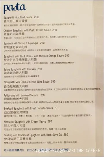 聽說Dazzing Cafe蜜糖土司專賣店在今年的一月一日開幕囉!地點就在高雄新光三越三多店的3F,在同事的推薦下,決定前去體驗看看到底是何種美味的程度XD但是打電話過去,都說定位已滿,必須至現場候位才行!可見得魅力是多麼地大XD因此派出先遣部隊前往卡位,順利得以進入一窺美味蜜糖土司的真面目!(PS.訂位詢問後可以在一個月前就預約!)可以使用手扶梯直接前往3F即可抵達目的地!一出口扶梯,前方欣賞一片綠意後,就是今天的目的地-Dazling Cafe。整家店面以藍色系與白色系構成,非常的典雅大方,又深具時尚感,有種吸引人進入的魔力存在!除了基本的坎燈照明外,裡頭的燈具都很有古色古香的感覺,就是有那種坐上一天都不會膩的FU!上頭就是店名招牌!英文Z字上頭還有閃閃發亮的元素,這可是時尚界的最愛!外頭的等候區牆上有著店家LOGO,就是貴婦人下午茶的代表符號!無法進入上流社會,來這體驗一下何謂貴婦人下午茶!到底是精緻在哪裡?好吃在哪裡呢?除了內用外。也能在這外帶吧!櫥櫃裡有著精緻的糕點,看了都是很誘人,似乎在散發著獨有的魅力!價上整齊的Dazzling Cafe也是精緻到不行!這就是所謂的一形成體,完全是同一風格!這台爆米花機也是相當引人注目!詢問店員後,才知道是之前活動時有進行贈送活動,現在變成展示用!貴婦人要吃的爆米花應該跟夜市賣的等級有差吧XD整個櫃臺就是整齊乾淨,很有設計感!上頭也有使用花瓶點綴著,讓整體的生命力更栩栩如生!注意看!服務生都是用蹲的跟顧客服務,真的是相當貼心,不會讓顧客抬起頭看服務生,很難得的一種體驗!走道周圍都會穿插鏡子元素在裡頭,不僅可以增大整體的視覺感受,也能讓美眉們照鏡子補各妝XD當然不免俗地都會附上招牌LOGO讓大家很清楚認識店家的店名,增加印象!你看看你看看,好大的用餐空間,但竟然預約不到,由此可知熱門程度!不管是在一區的位置,都會有著屬於那一區的獨特味道及視野。從每一桌的顧客表情來看,都是滿足的表情,可見得食材的美味與整體的魅力! 最喜歡這種靠窗的位置,很有自己的獨有VIEW空間,很難得能在家中享受到這種開放式的感受!看著窗外發呆是小圓爸最喜歡做的一件事,在這裡更能有這種滿足的提供!眼尖的網友一定有注意到,有種座位相當特別!就是這款兔耳朵的款式,很有愛麗絲夢遊仙境的感覺,對少女們應該會更具莫大的吸引力才是!連我都想坐看看XD來到座位區每杯水杯下也有著Dazzling Cafe的杯墊,杯墊裡頭圖案帶著蕾絲邊,就是公主風走向!一樣是深深吸引少女們的心思!可見店家真的是有在思考顧客取向,難怪生意會如此之好!不是沒有原因!我們也坐在靠窗的座位區,可以讓小圓爸享受著片刻放空的時刻!各位也可以試試把腦袋先停機一下,好好地讓身體感受這片刻的寧靜吧!看到桌上的MENU才知道她的中文名字--『玳思琳蜜糖土司』也是用字相當別緻的名稱! 大家可以先從藍底白色的MENU先好好挑選著想吃的種類,來到這最重要的是一定要留一些裝甜點的胃!不要錯過了受到眾人推崇的這一美味!蜜糖土司的DM圖片就在這,可以先參考看看,看看想吃的種類或是整體造型搭配來決定!記得也不要一次吃過多,多找幾個人來吃準沒錯!以免一個人吃不完或是會太膩的情形出現!決定好之後就可以請服務生過來點餐,確認餐點後就可以完成點餐手續!接下來就是好好期待的時間囉! 義大利麵的價格在220-280元之間,說貴也不是太貴!說便宜當然不便宜囉!XD這是『橙汁芥末鴨胸麵』!要價240元!據同事說法,吃起來有橙汁口味,會特別爽口,不會有油膩感!這是『佛羅倫斯干貝蟹肉麵』,要價280元,是裡頭最高檔的等級喔! 這是『青醬奶油雞腿麵』,要價240元,怕吃不夠的人可以點這一道,雞腿肉是相當夠份量的! 這是『西西里蕃茄海鮮麵』,要價270元,只要與海鮮扯上關係,價格就是高居不下!對價格有會有意見的人,可以在多作考量XD 這是『辣味雞肉義大利麵』,要價240元,吃起來就像是三杯雞的感覺,辣中帶勁,非常台式的一道義大利麵料理!如果吃不慣異國料理,其實就可以點這道來品嚐看看,只是有些吃不慣太辣的人,可能就受不了這道料理帶來的後勁十足!麵條吃起來是有Q度帶勁道,只能用爽口清脆來形容,搭配上九層塔真的是把味道帶入令另一種境界之中!這是『樂活蜜桃柚香冰茶』,原價140元,點套餐加購只要50元!喝起來是柚子茶的感覺,搭配眾多的配料,很豐富的一杯飲品!這是『冰釀蜂蜜蘋果茶』,原價140元,點套餐加夠只要50元!裡頭也是很給力的都是滿滿的蘋果顆粒,吃起來也是相當有飽足感!這是『四水果茶』,原價160元,沒有加購價服務,茶包還幫你放在一旁,避免泡過頭,味道太濃郁,旁邊是棉花糖,你可以直接食用或是放入茶中慢慢融化,享受不同時間點的不同味覺刺激!另外還有砂糖與牛奶供顧客進行調味,真的是一道飲品有多種喝法,變化真是莫測! 這是『洋甘菊蘋果茶』,熱飲要價160元,沒有加購價!將蘋果粒另外放在杯中,可以很清楚感受到蘋果粒在茶中悠遊的感受!讓水果與洋甘菊經過對話,溝通出一道溫潤的好滋味,適合女士們在悠哉午後的獨家享受!吃完主餐後,有沒有記得留胃的空間阿!還有最重要的主角尚未登場!蜜糖土司就要大駕光臨囉!這是『抹茶蜜紅豆蜜糖土司』,要價240元!土司是層層堆疊的組合上頭淋上奶油與冰淇淋的雙重口感,再淋上抹茶醬,上頭點綴著馬卡龍、餅乾與