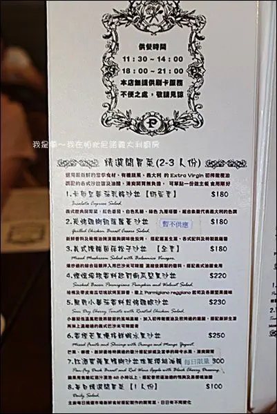 菜單有開胃菜、義大利麵、燉飯、飲品和酒單,點主餐可加價升級為套餐,不過套餐的飲料和甜點都不太吸引我們,所以選擇單點主餐,再加一道開胃菜一起分食,然後又有打卡送的沙拉,對女生來說其實很足夠。