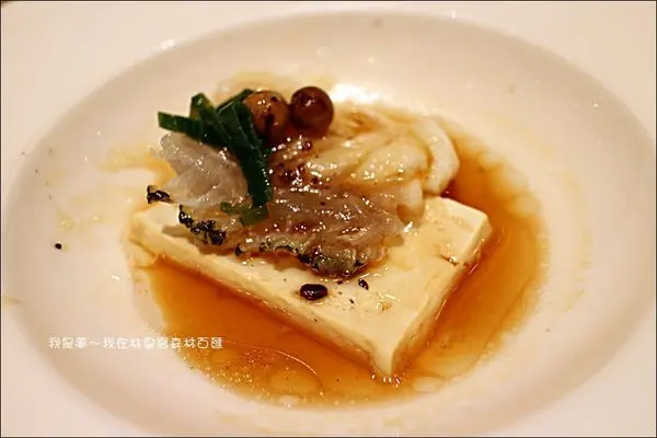 這是吃到尾聲時出現的龍膽石斑,排隊拿來的,底下是豆腐,魚肉當然只有一小片,肉質很Q彈,很有膠質。