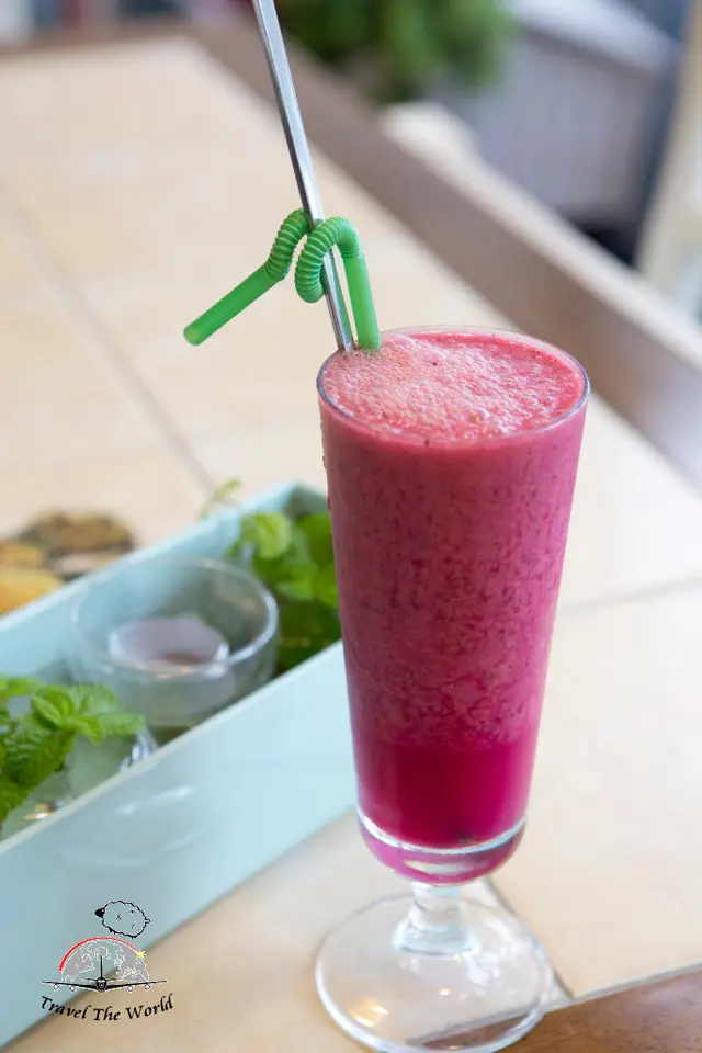 鳳梨、芭樂、紅肉火龍果、百香果、蘋果、芒果特製的綜合水果汁。