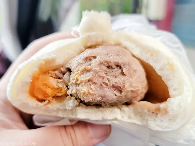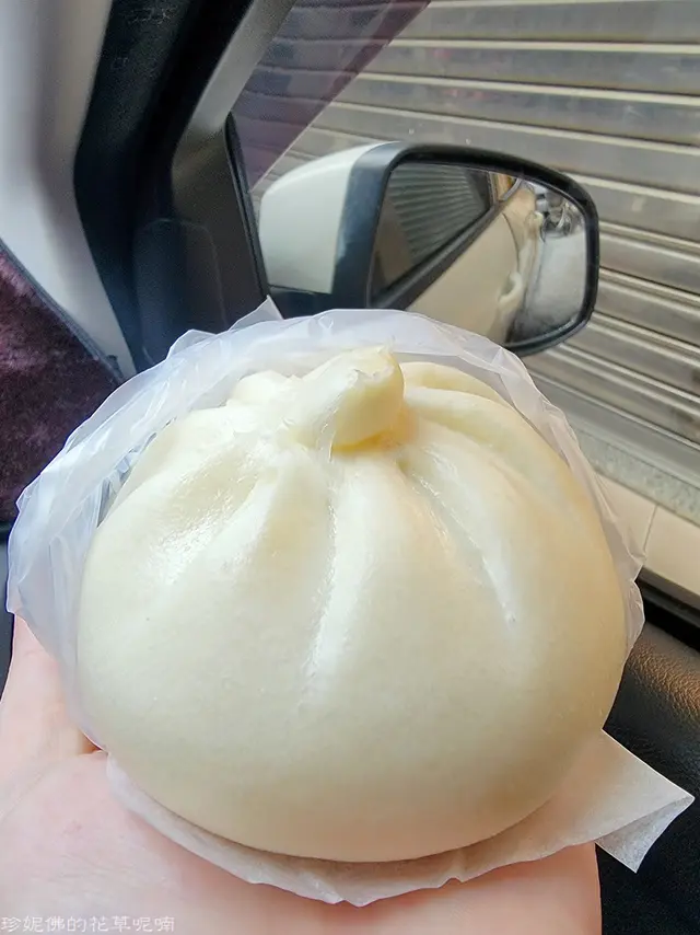 ▲在車上就忍不住先吃了一顆蛋黃肉包,外觀飽滿