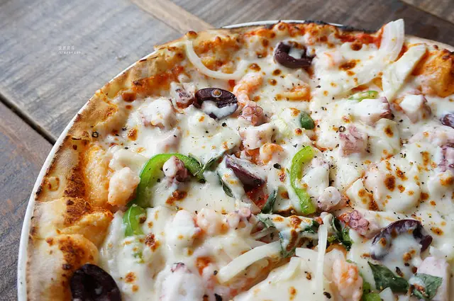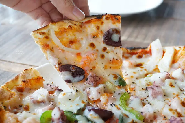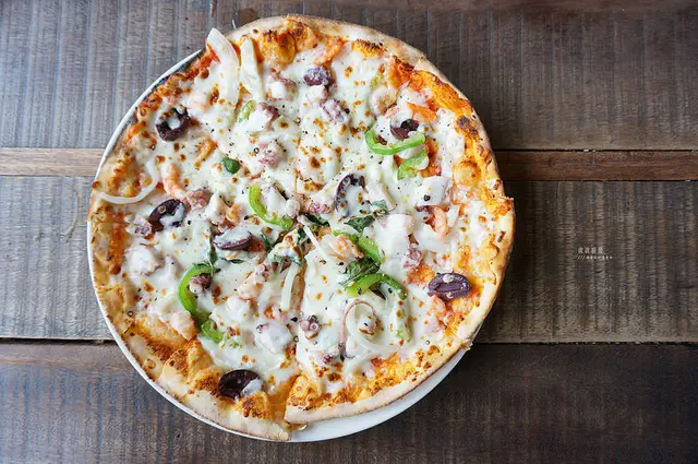 上頭配料很豐富,有章魚、瞎子、洋蔥、青椒、橄欖等,我最喜歡章魚丁,口感Q彈有咬勁