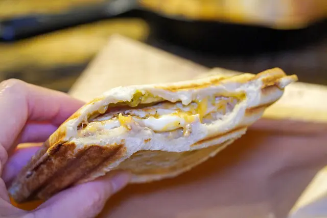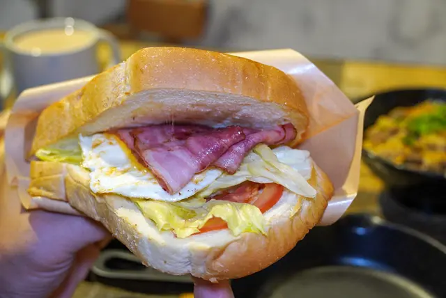 用奶油香煎,濃郁的奶香瞬間胃口大開,夾進大片培根、荷包蛋、生菜、起司、番茄,很適合趕時間的開車朋友外帶吃