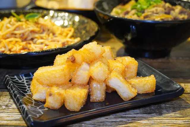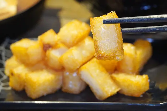 柴點的糕渣也很受歡迎,把蘿蔔糕切成小塊油炸,每一面都炸得金黃,外酥內嫩嚼感十足