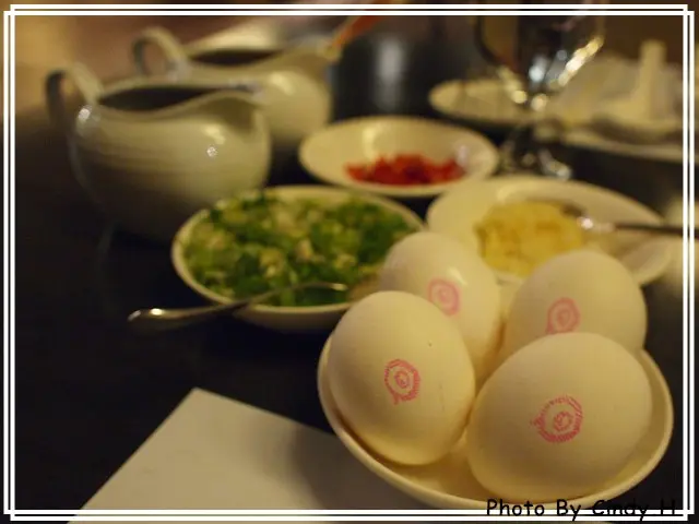 就坐後服務人員先送上火鍋沾醬與雞蛋,黃鴨子喜歡用甘甜的海鮮醬油加上蔥花、辣椒與蒜末一同沾食,而雞蛋則是下鍋煮成半熟蛋包。不過這天吃的很飽,最後四顆雞蛋還是好端端的留在桌上沒吃到,可惜了這好蛋~